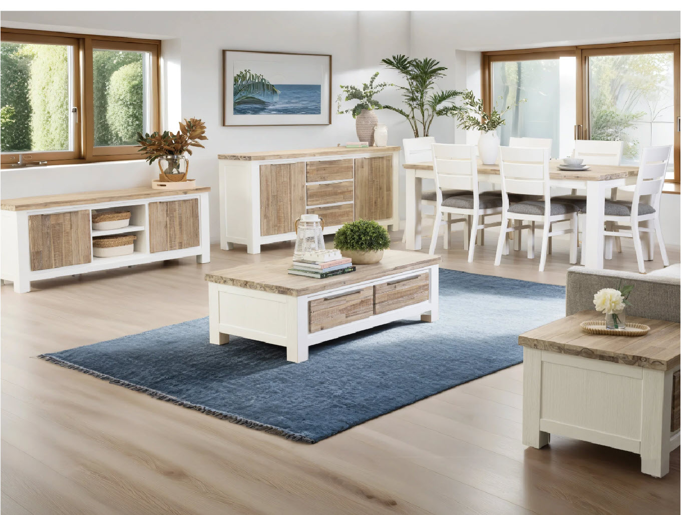 The Homestead Collection blends coastal serenity with refined country styling, creating an elegant foundation for contemporary Australian interiors. Defined by its whitewashed frames and natural Acacia timber tops, this range introduces lightness, warmth and timeless appeal to both living and dining spaces.